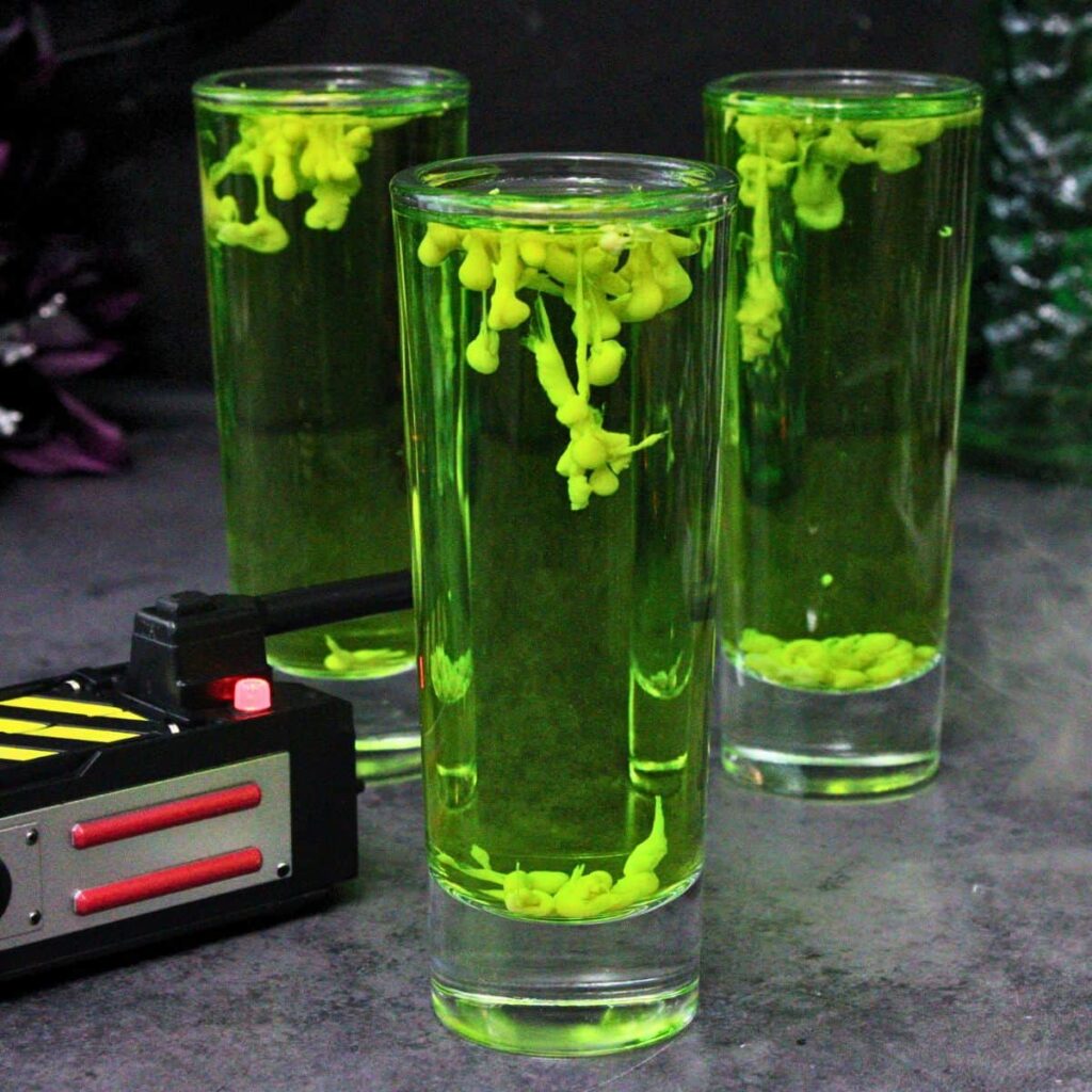 - Use clear or glow-in-the-dark shot glasses to match the “Slimer” vibe