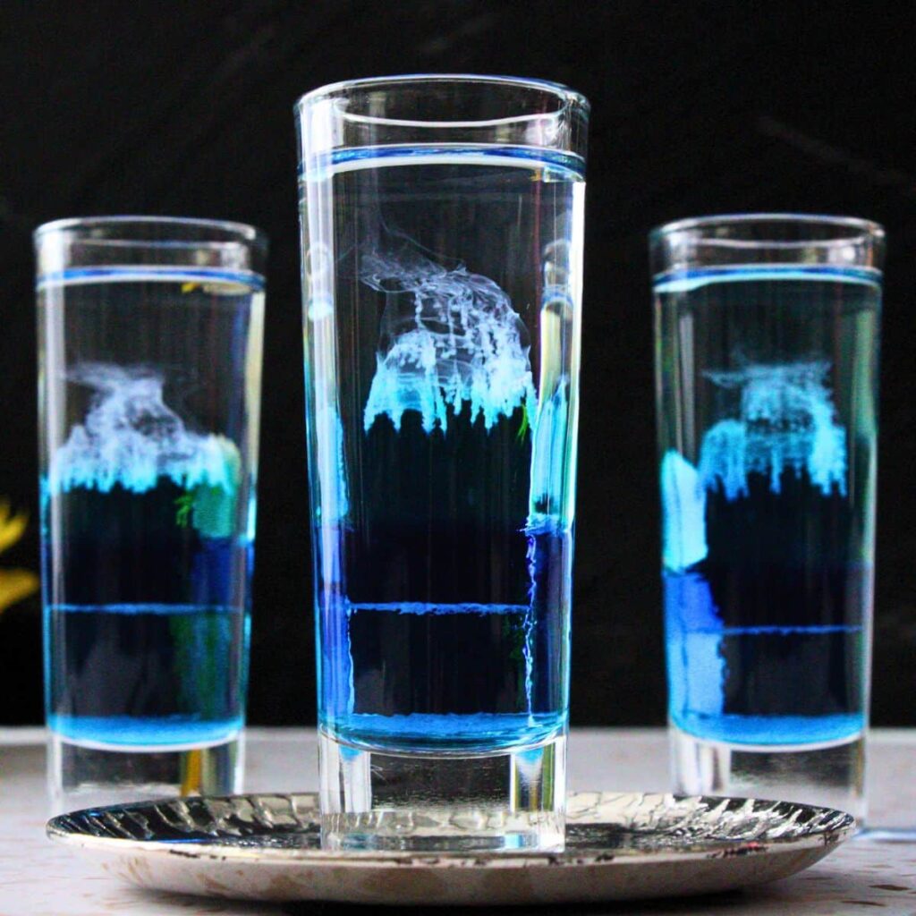 A blue jellyfish shot is a beautiful layered shot made to resemble a jellyfish floating in water. It combines blue curaçao, sambuca, vodka, and a bit of heavy cream or a cream-based liqueur carefully dropped in to create a “jellyfish” tentacles effect.